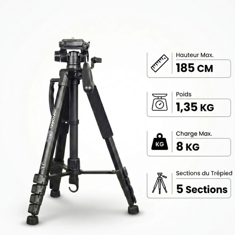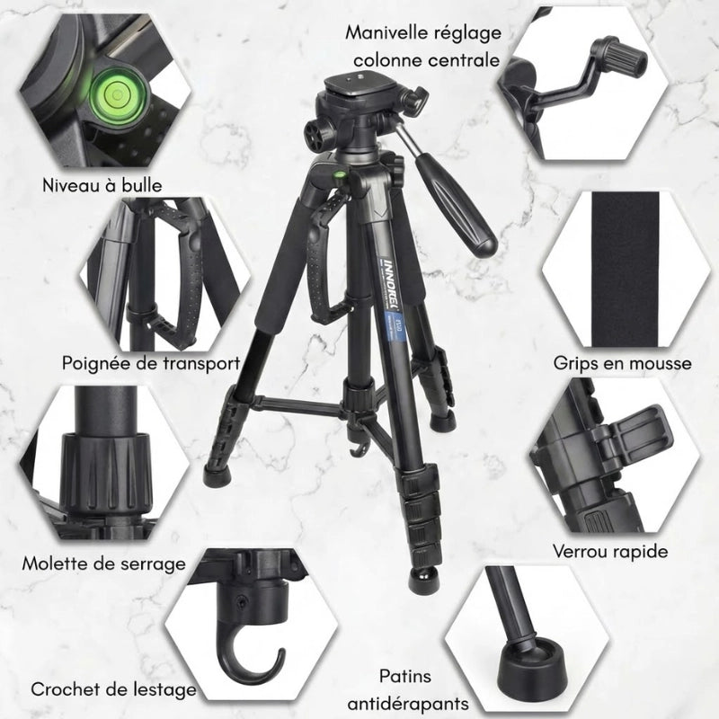 Le trépied aluminium 185 CM se distingue par une amplitude de réglage importante, une conception orientée stabilité et un confort d’utilisation accru grâce aux poignées en mousse. Les autres supports conçus en aluminium sont regroupés dans l’univers Trépied Aluminium, adapté aux usages photo et vidéo nécessitant hauteur et rigidité.